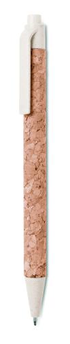 Push button ball pen with cork barrel and Eco-friendly wheat straw (50%) and ABS plastic (50%) fittings. Blue ink. Cork is a natural material, due to its structural nature and surface porosity the final print result per item may have deviations.