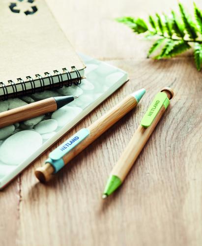 Push button ball pen with bamboo barrel and wheat straw (50%) and ABS (50% ) fittings. Blue ink. Bamboo is a natural product, there may be slight variations in colour and size per item, which can affect the final decoration outcome. FSC®-certified | FSC 100%, N5.7, FSC-C213206