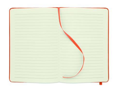 A5 notebook with hard 600D RPET cover. Casebound. 160 lined recycled paper pages (80 sheets). Matching elastic closure strap and ribbon bookmark. FSC®-certified | FSC MIX CREDIT, P7.1, FSC-C213206