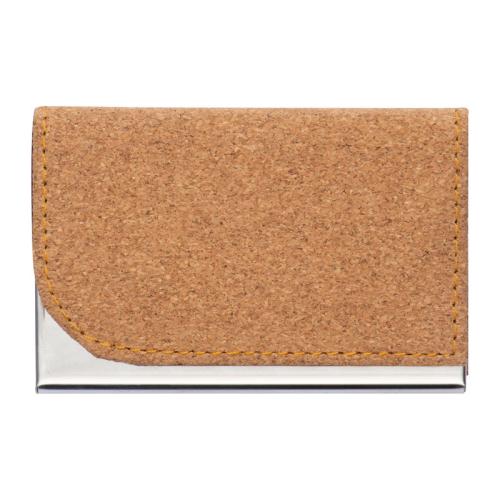 Metal Business Card Holder with cork surface and magnetic catch.