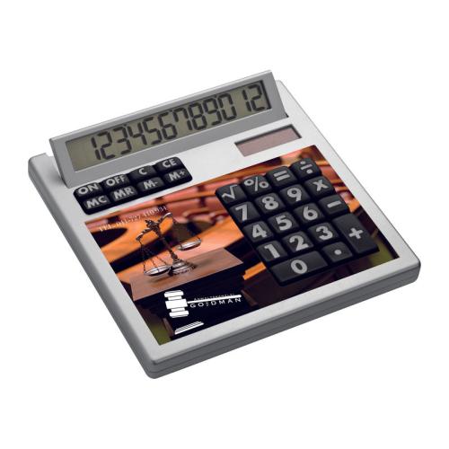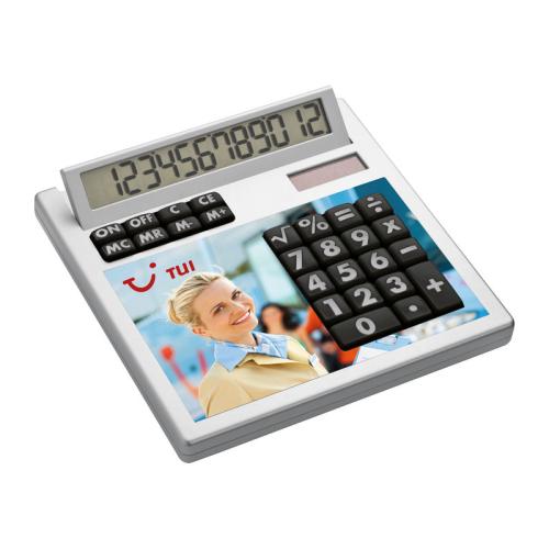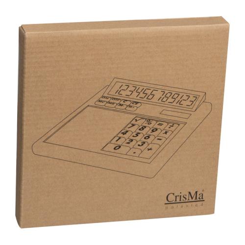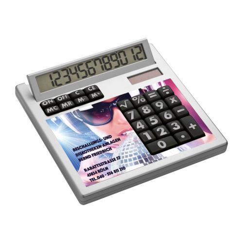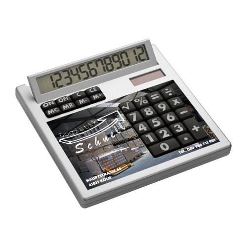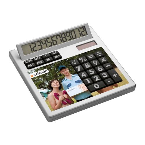 CrisMa design desk calculator with 12 digits and solar power made of silver plastic. Unique, thanks to the digital printing possibilities -create your calculator just as you like.