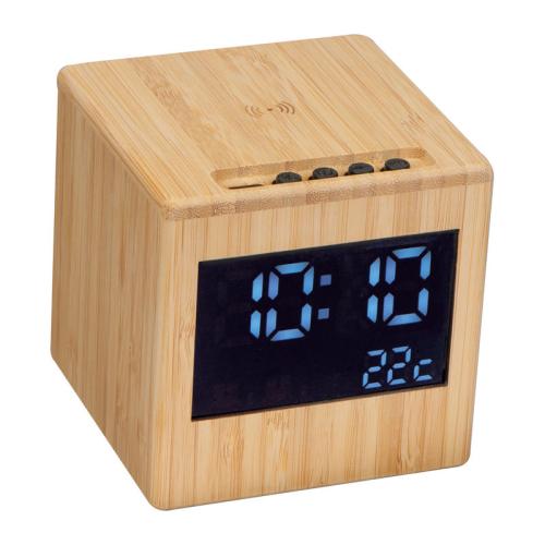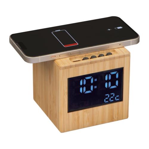 Bluetooth speaker (version 5.3) made of bamboo with wireless charger up to 15 watts and digital time display, alarm function and temperature display. The rechargeable battery has a capacity of 1200 mAh / 3.7 volts.