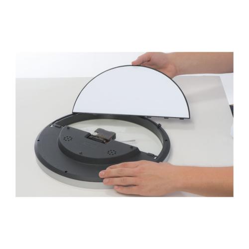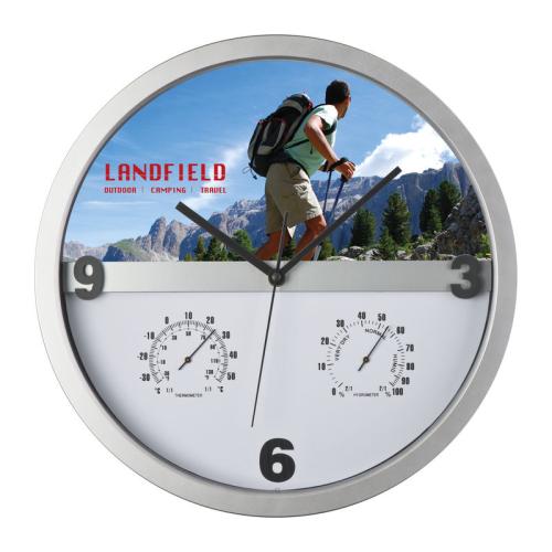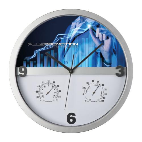 Stylish wall clock with hygro and thermometer - the key is that half of the display can be easily taken out and printed allover. Endless possibilities for printing your logo!