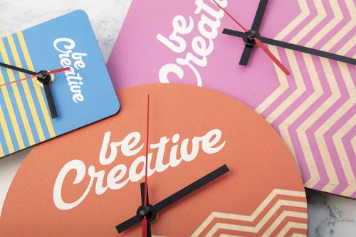 Custom made, HDF wood table clock with custom graphic. Operates with 1 AA battery, without battery. MOQ: 50 pcs.