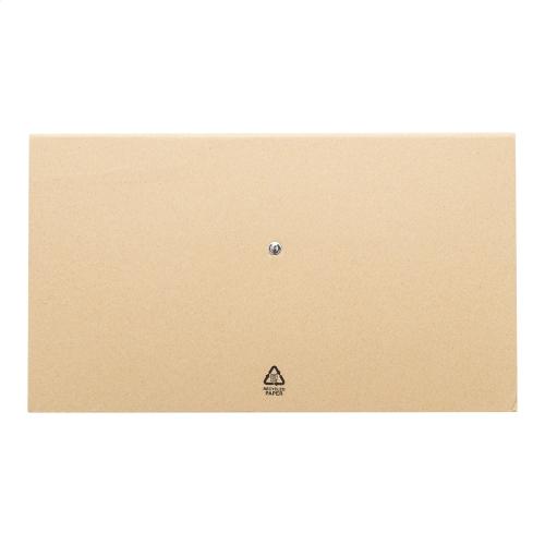 Recycled paper desktop calendar set with 50 undated weekly planner sheets, 100 sticky notes (in 4 colours) and 125 page markers (in 5 colours). Includes recycled paper ballpoint pen with blue refill.
