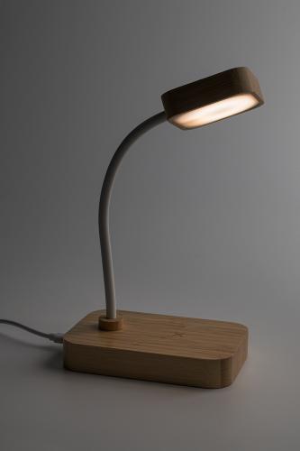 Bamboo multifunctional desk lamp with 12 LEDs and built-in wireless fast charger (15W). With warm, natural and cool light modes and adjustable brightness. Including USB charger cable.