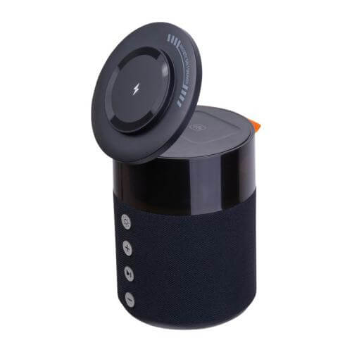 5-in-1 5W Bluetooth 5.4 speaker from Ferraghini with integrated wireless charger for a smartphones, AirPods, and Apple Watches, comes with a USB-C cable. 1800 mAh battery, runnig time 4-6 hours. Features LED sleep light.