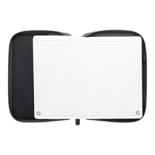 Zipped luxury document folder in recycled PU leather, with 64 lined sheets notepad in recycled paper. Featuring multiple interior pockets for cards and documents. A5 size.