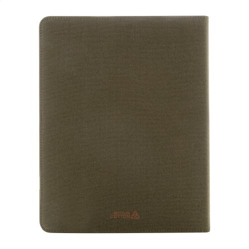 A4 sized, recycled canvas and recycled PU leather document folder with multiple front and inside organizer pockets. With 20 lined sheets notepad in recycled paper. 70% recycled cotton and 30% RPET polyester.