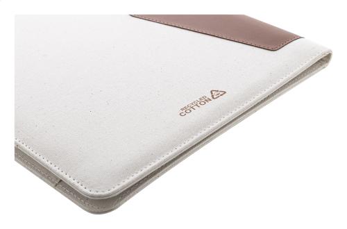 A4 sized, recycled canvas and recycled PU leather document folder with multiple inside organizer pockets. With 20 lined sheets notepad in recycled paper. 70% recycled cotton and 30% RPET polyester.