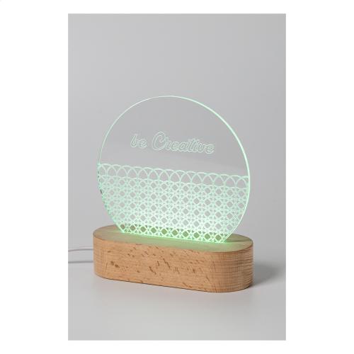 Custom made acrylic trophy on wooden base with USB powered multicolour LED light. In unique shape with engraved graphics. With USB charger cable. Price includes engraving. MOQ: 10 pcs.