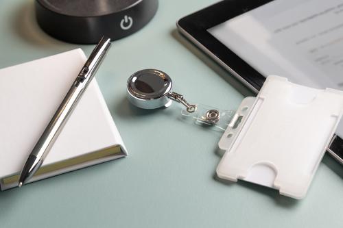 Exclusive metal badge holder with high gloss metallic finish. With press-stud closure, telescopic line and metal clip.