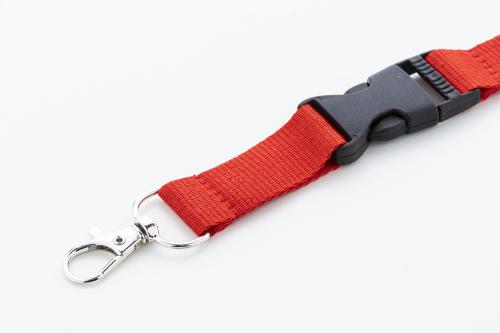 RPET polyester lanyard with detachable metal carabiner and safety buckle.