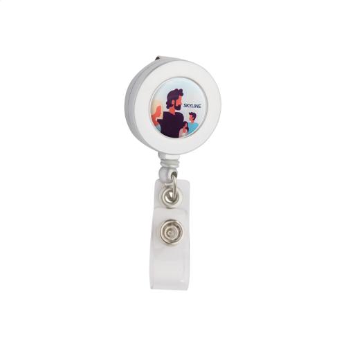 Plastic badge holder with press-stud closure, telescopic line and metal clip.