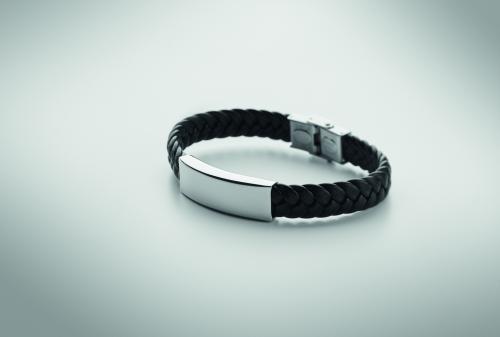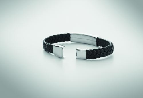 Braided faux leather cuff bracelet with polished steel hardware. Push-lock clasp. Wrist circumference: 21 cm.