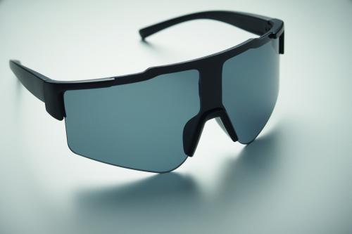 Sports sunglasses with mirrored lenses and black frame. UV400 protection.