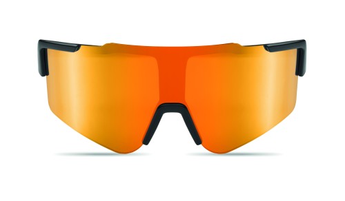 Sports sunglasses with mirrored lenses and black frame. UV400 protection.