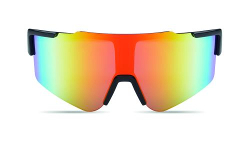 Sports sunglasses with mirrored lenses and black frame. UV400 protection.