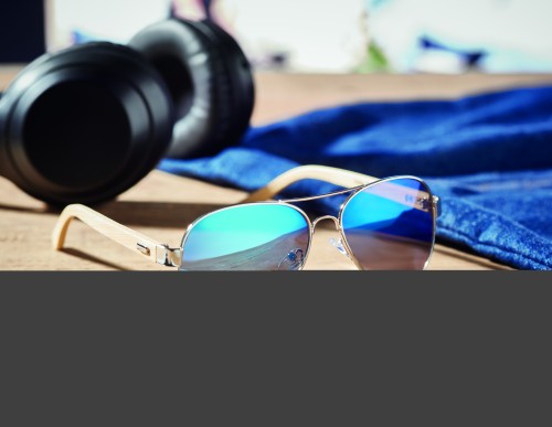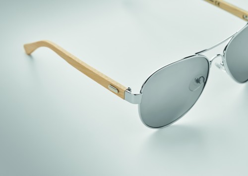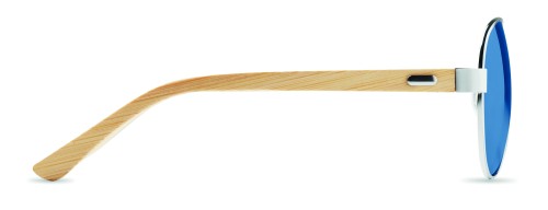 Sunglasses with bamboo arms and coloured mirrored lenses in microfibre pouch. UV400 protection. Bamboo is a natural product, there may be slight variations in colour and size per item, which can affect the final decoration outcome.