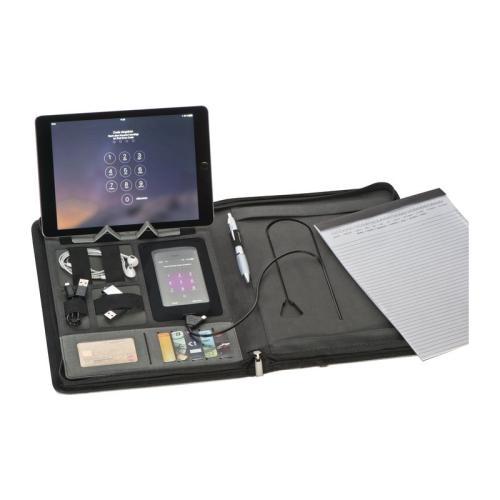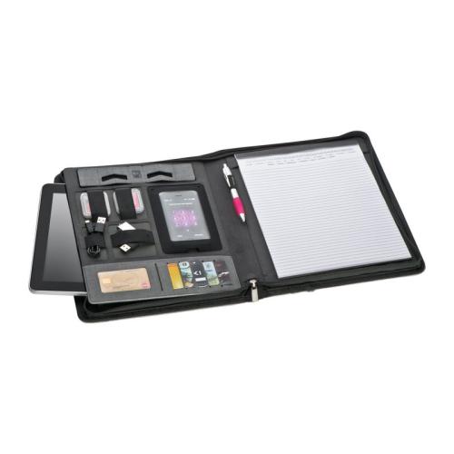 A4 folder made of bonded leather with integrated powerbank (5.000 mAH capacity), USB-cable, 8 pockets, cell-phone pocket, ball pen loop, tablet pocket and a note pad.