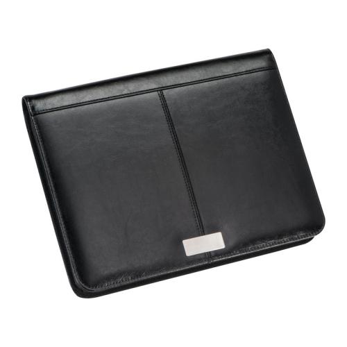 A4 folder made of imitation leather, with zipper, slip pocket, business card slots, pen loop, smartphone holder and stand, compartment for tablet or notebook, and lined block with a small calendar impression.