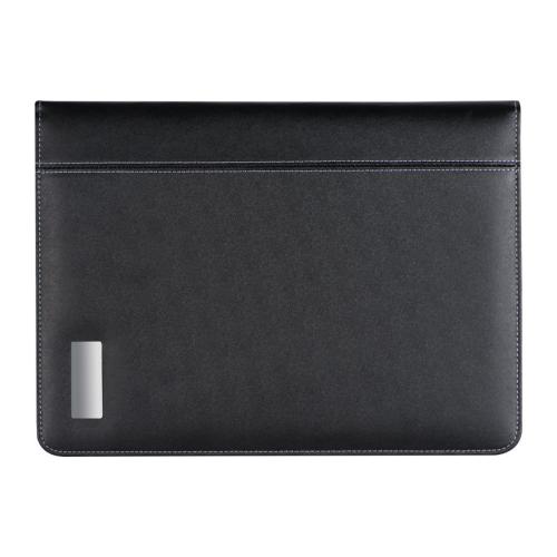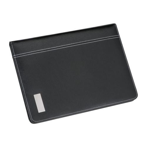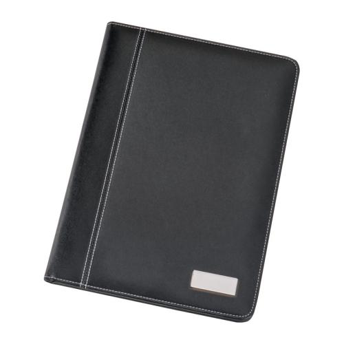 A4 folder made of imitation leather, slip pocket, business card slots, pen loops, smartphone holder and stand, and lined block with a small calendar impression.