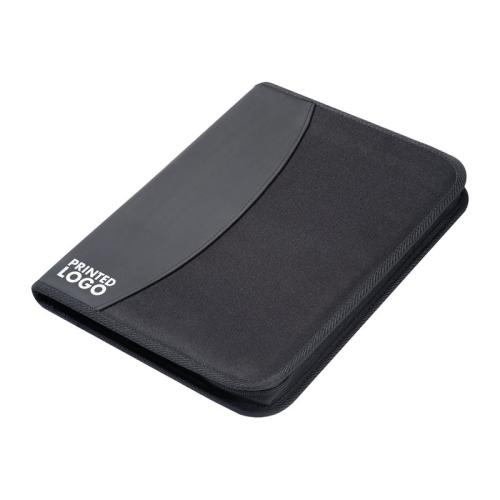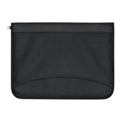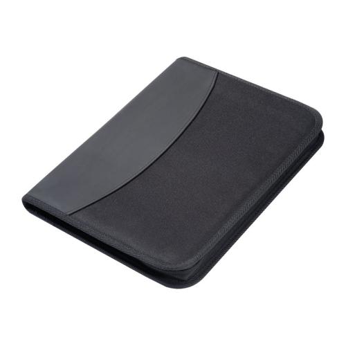 A4 conference folder made of 600D polyester, with note pad, several organizing compartments, and zipper.