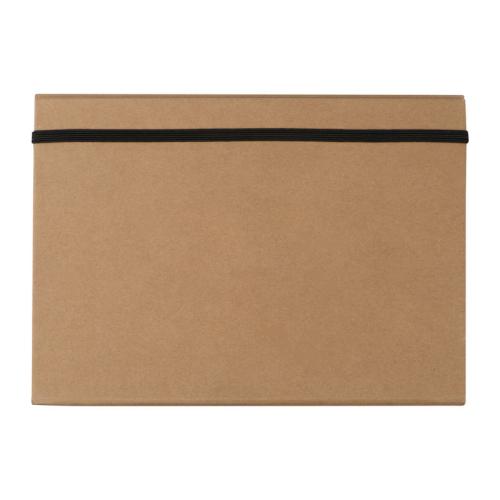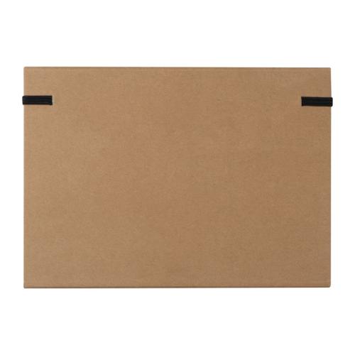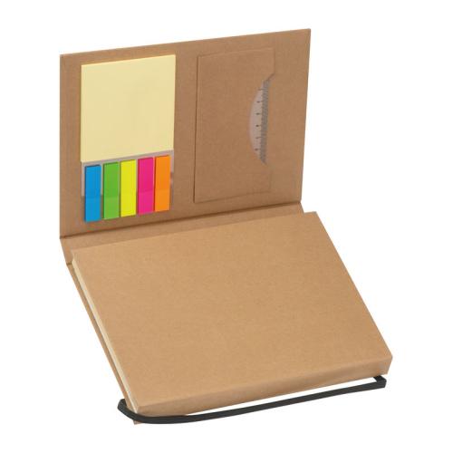 Double foldable writing case made of cardboard with closing rubber band. The case includes an 80-pages note pad, 20 coloured sticky markers in 5 different colours, notes, two rulers, pen, sharpener, eraser, and two pencils.