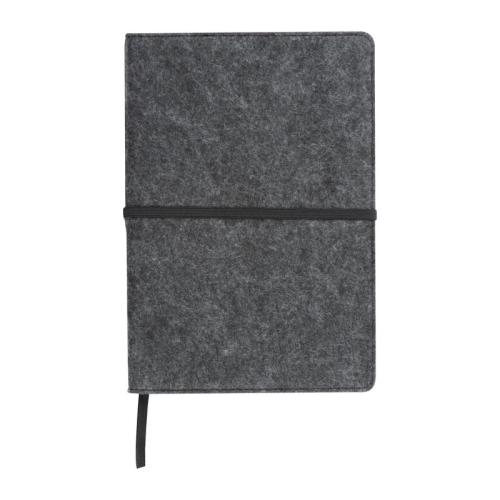 A5 notebook with felt cover, ribbon, rubber band closure, and 192 squared pages.