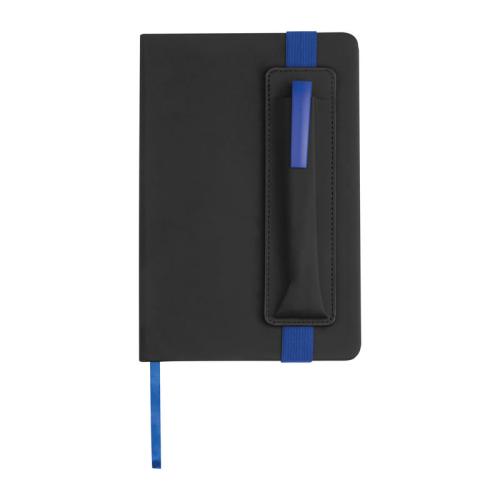 A5 Notebook with PU-Cover, 192 ruled Papers, Bookmark and an elastic band to close, including Pen Holder.