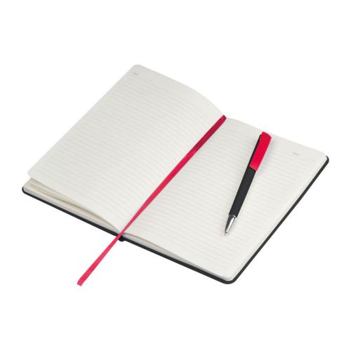 A5 Notebook with PU-Cover, 192 ruled Papers, Bookmark and an elastic band to close, including Pen Holder.