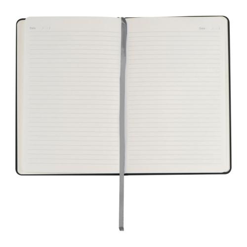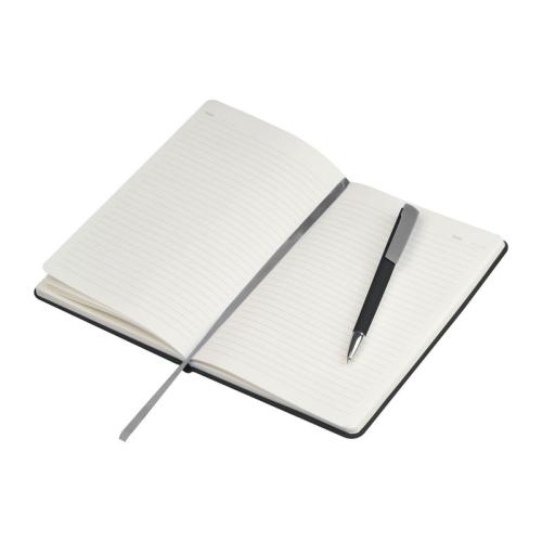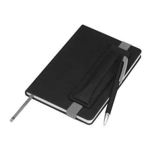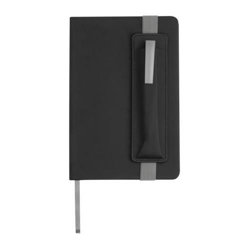 A5 Notebook with PU-Cover, 192 ruled Papers, Bookmark and an elastic band to close, including Pen Holder.