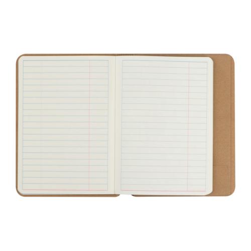 Notebook with rubber band for closing, 120 lined pages and extra compartment.