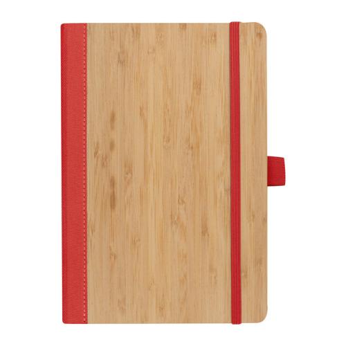 Notebook with cover made of bamboo and recycled polyester on the back. The notebook has 192 lined pages, a ribbon bookmark and a biro loop.
