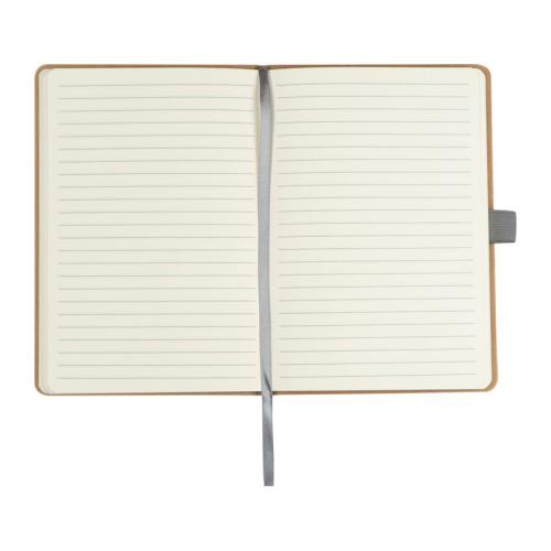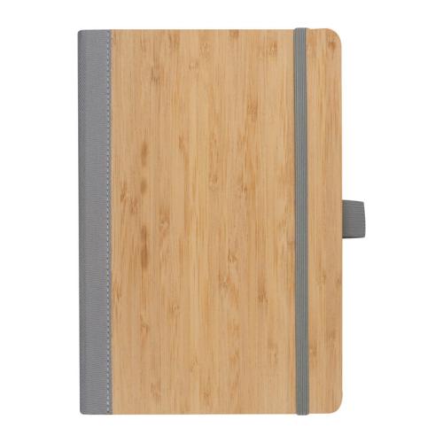 Notebook with cover made of bamboo and recycled polyester on the back. The notebook has 192 lined pages, a ribbon bookmark and a biro loop.