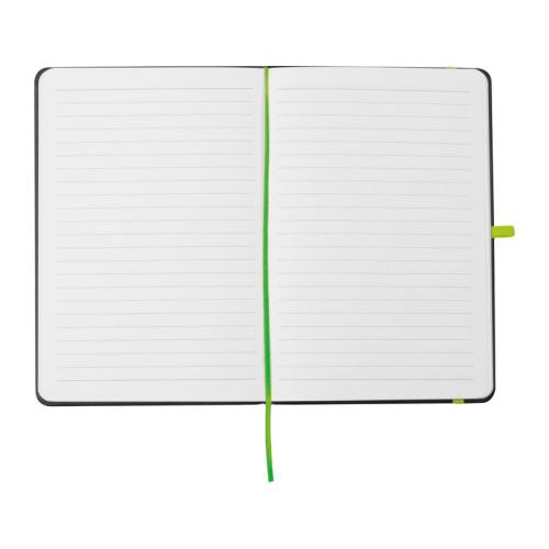 A5 notebook with imitation leather cover and 192 lined pages, coloured ribbon marker and elastic band.