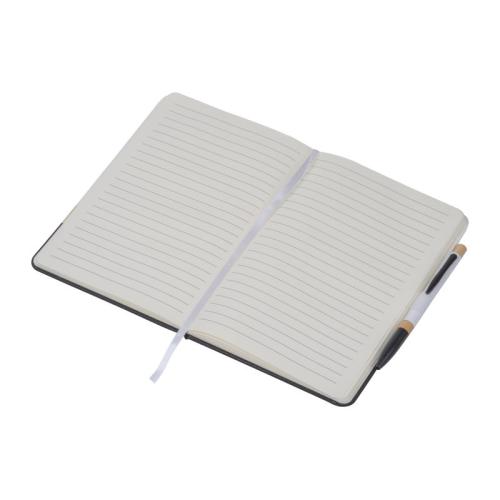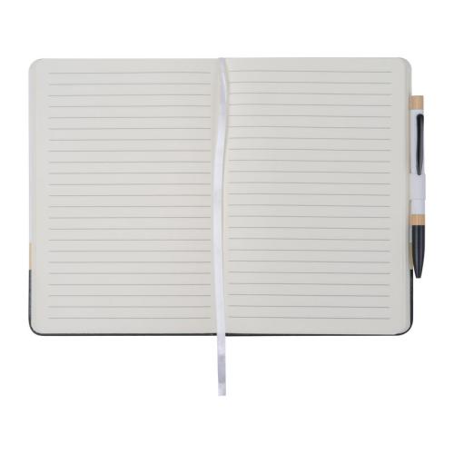 A5 notebook with ballpoint pen. The notebook is made of recycled paper (160 lined pages), bamboo, and PU. The matching pen is made of aluminum and bamboo. Perfect for notes, ideas, sketches, and more.