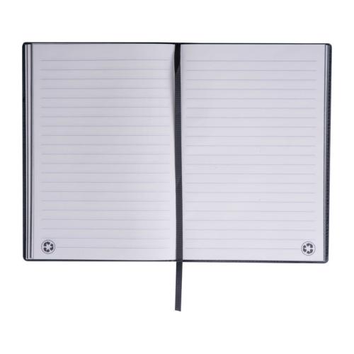 A5 notebook with soft PU cover, 160 lined pages (80 sheets) made of recycled paper, ribbon bookmark, and elastic closure.