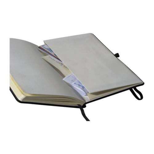 Trendy A5 notebook with rubber band, pen loop, and pocket loop. Features folding compartment at the back for all those important papers.
