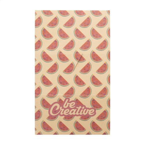 Custom made kraft paper note dispenser with vertical header. Includes 50 sheets of recycled paper sticky notes (75×75 mm) and 100 plastic film page markers in 5 assorted colours (44×12 mm). Price includes full colour printing on the header. MOQ: 100 pcs.