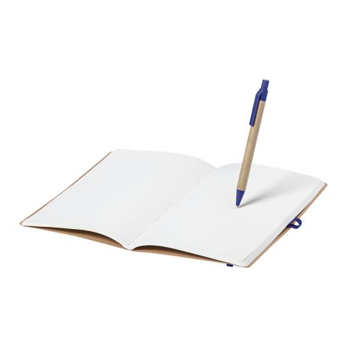 Recycled cardboard covered notebook with 60 blank sheets and coloured rubber strap, A5 size. Including wheat straw plastic ballpoint pen with blue refill.