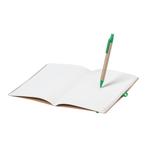 Recycled cardboard covered notebook with 60 blank sheets and coloured rubber strap, A5 size. Including wheat straw plastic ballpoint pen with blue refill.