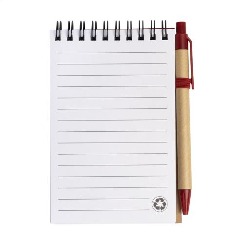 Recycled paper, spiral notebook with 70 lined sheets. With recycled paper ballpoint pen, with blue refill. A6 size.