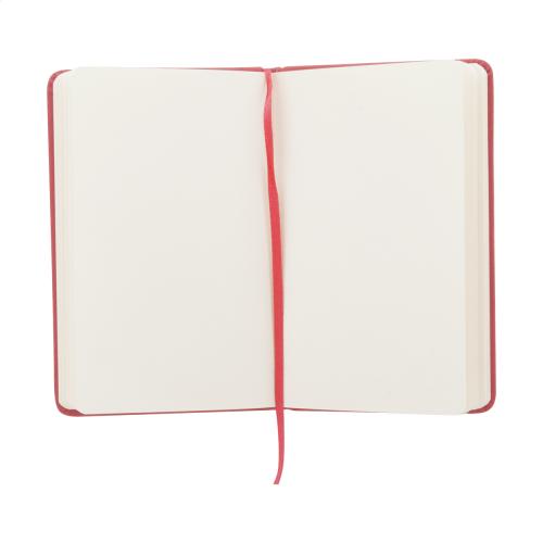 PU leather covered notebook with 100 blank sheets, bookmark and rubber strap. A6 size.