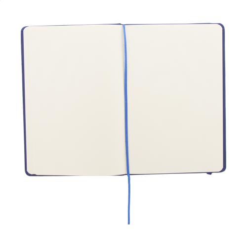 PU leather covered notebook with 100 blank sheets, bookmark and rubber strap. A6 size.