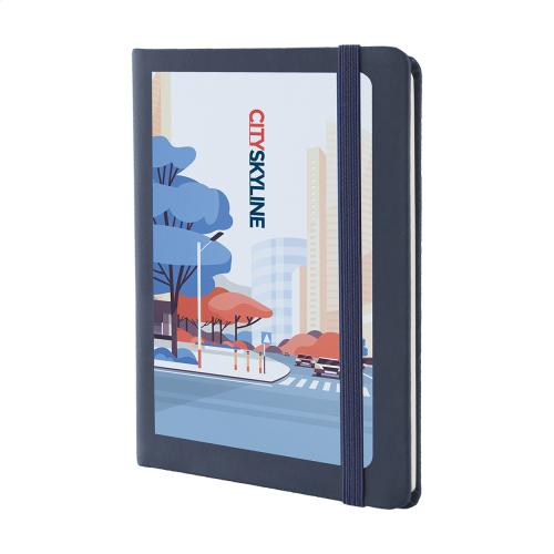 PU leather covered notebook with 100 blank sheets, bookmark and rubber strap. A6 size.