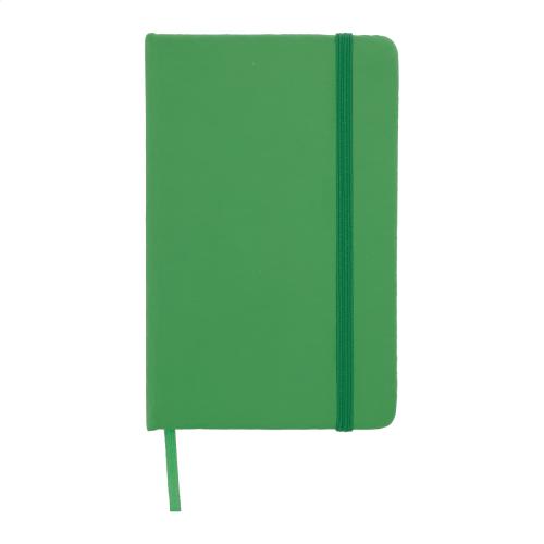 PU leather covered notebook with 100 blank sheets, bookmark and rubber strap. A6 size.