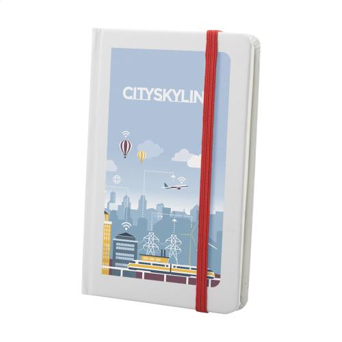 White carton covered notebook with 80 blank sheets and coloured rubber strap. A6 size.