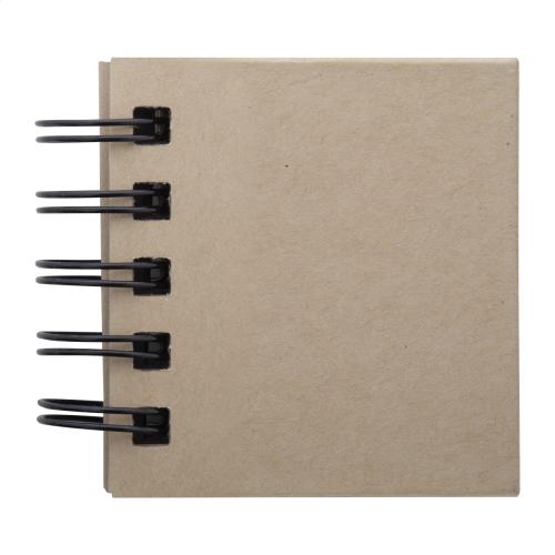 Recycled paper spiral notepad with different sized sticky notes (5x25 small and 3x25 large).