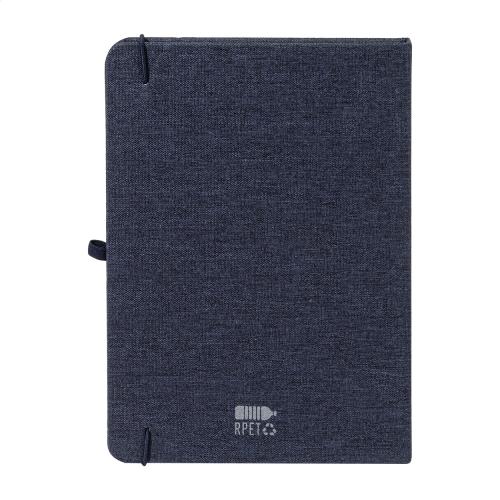 300D RPET polyester covered notebook with 80 blank sheets. With matching colour rubber strap, bookmark and pen holder. A5 size.